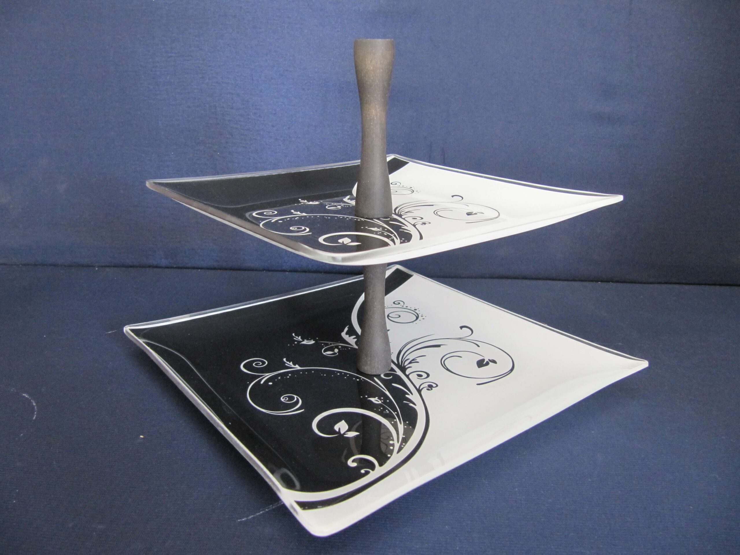 Фруктовница декоративная сувенирная квадратная, из двухцветного моллированного стекла, декорирована, цветовой фон черно-белый; стойка деревянная,черная.
