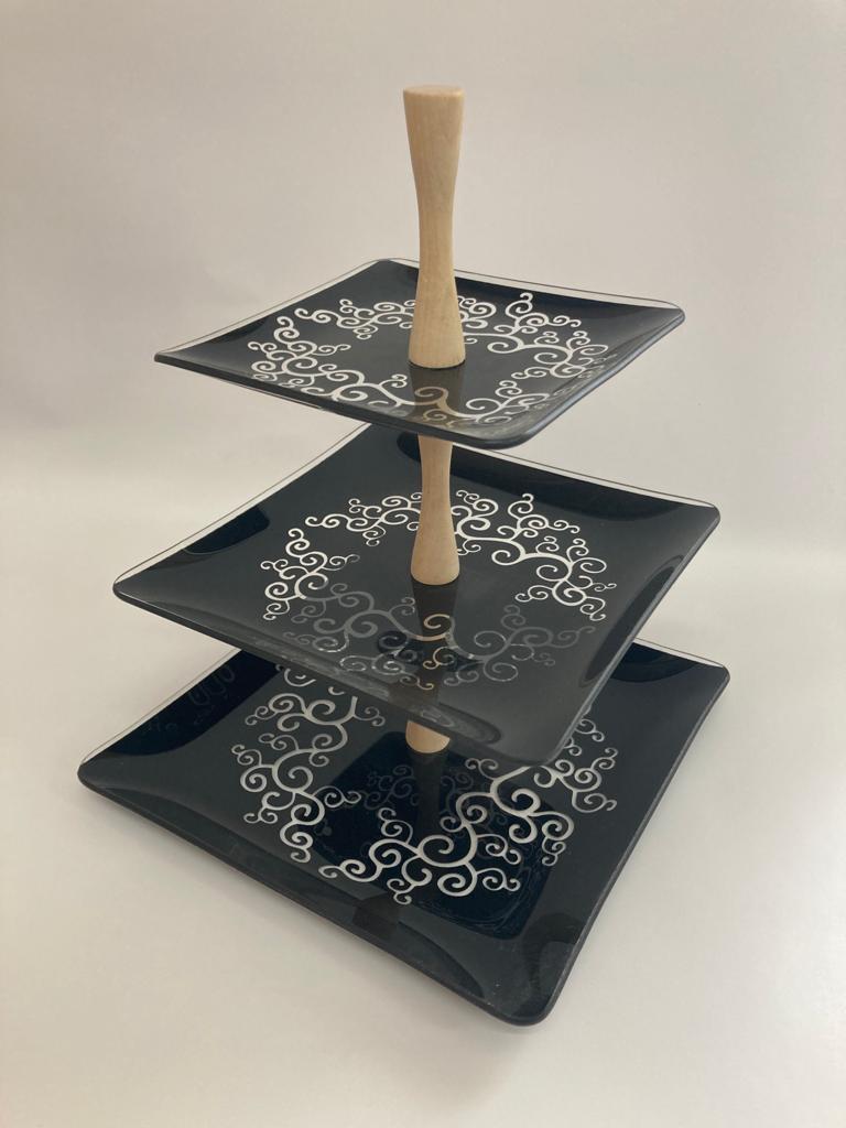 Фруктовница декоративная сувенирная квадратная, из двухцветного моллированного стекла, декорирована, цветовой фон по заказу покупателя; стойка деревянная,черная, белая.