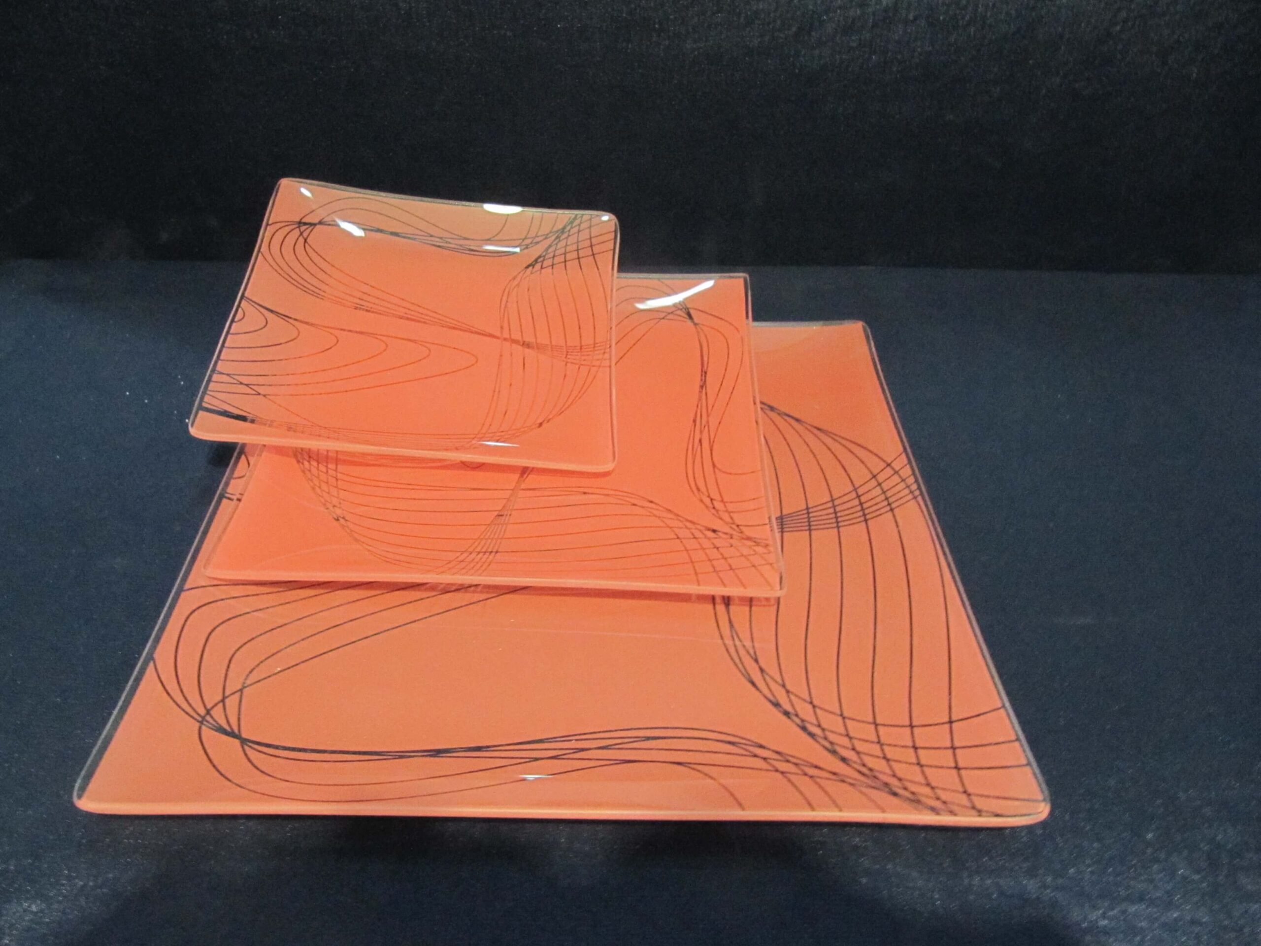 Тарелка декоративная подарочная квадратная, из бесцветного моллированного стекла, декорирована, цветной фон любой (в данном случае – шампань и красный)