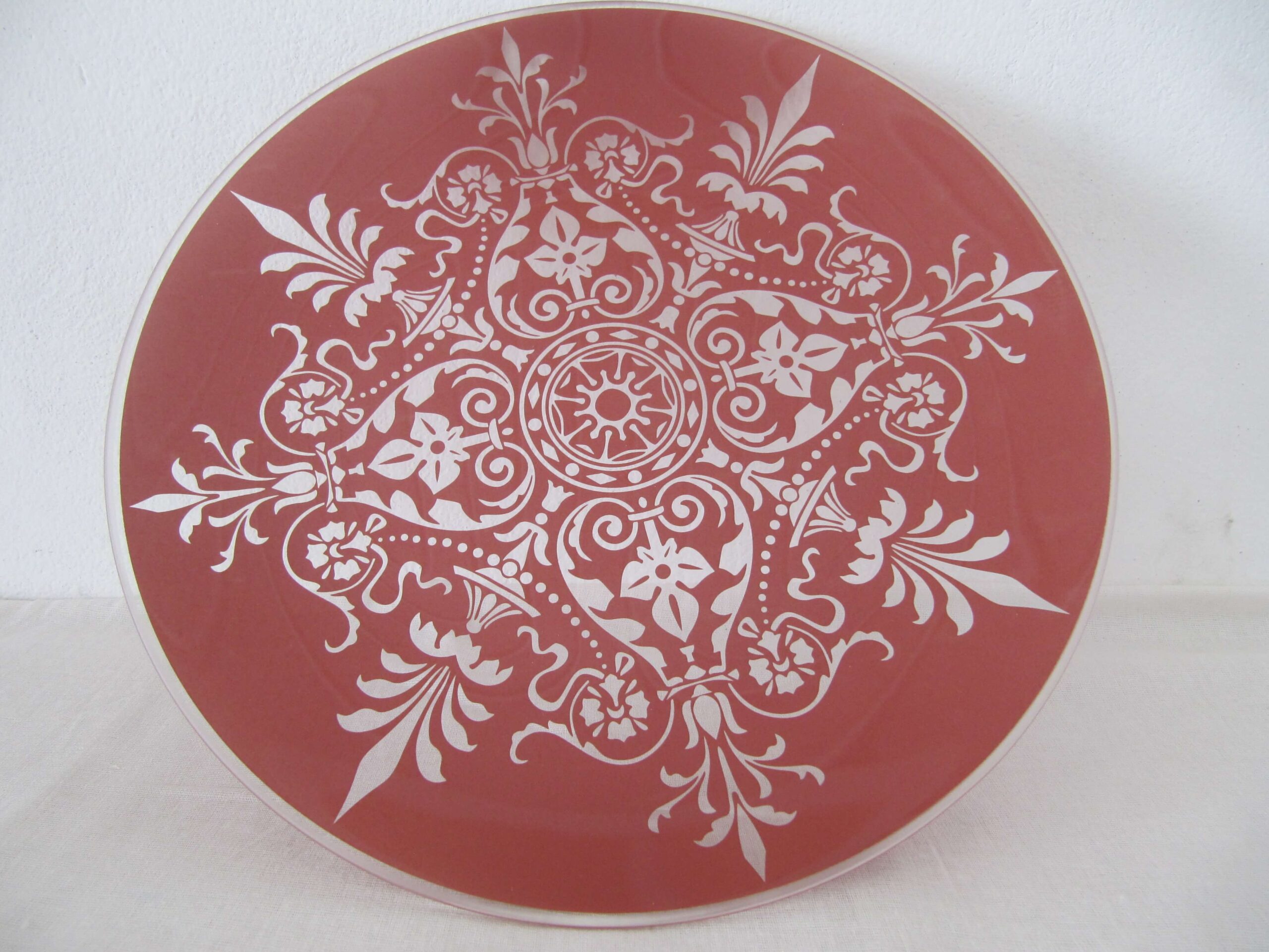 Тарелка декоративная подарочная круглая, из бесцветного моллированного стекла, декорирована, цветовой фон любой (в данном случае – бордовый )