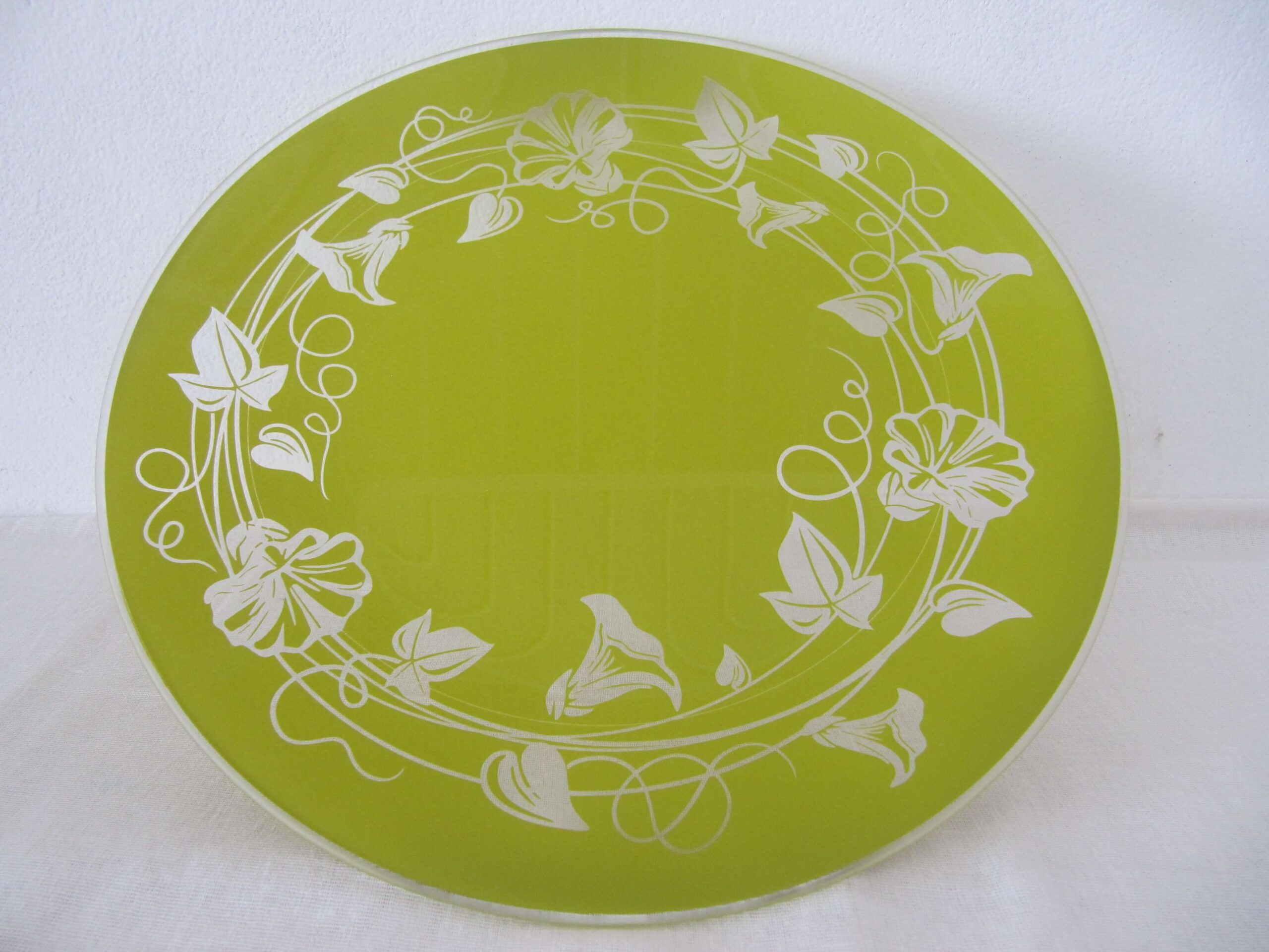 Тарелка декоративная подарочная круглая, из бесцветного моллированного стекла, декорирована, цветовой фон любой (в данном случае – зеленый )